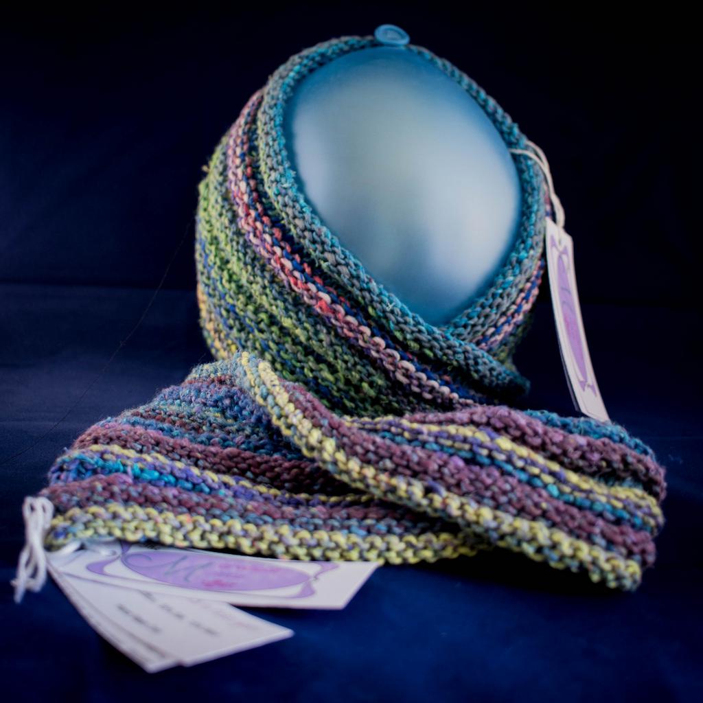 The scarves are knitted in one piece, with no seams, demonstrating a true Moebeus strip design. Designed to be loose around the neck these mufflers trap a cushion of air and are comfortable, soft and warm.